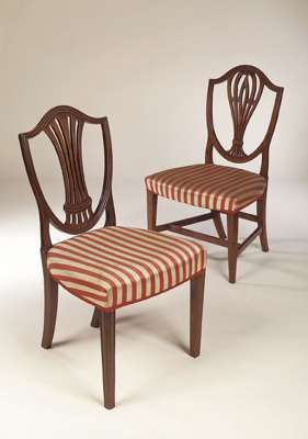 each with shield shaped back with pierced vase shaped splat, above red and white striped upholstered seat on channelled square tapering legs; and another three similar (8)