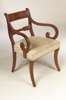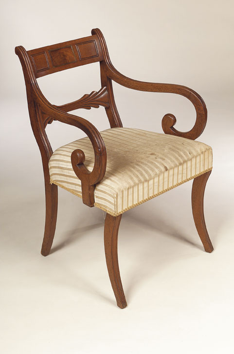 the brass line inlaid tablet toprail above gadrooned waisted horizontal splat, channelled down scrolled arms, the lemon upholstered seat on channelled sabre legs