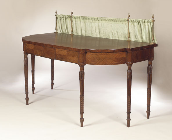 with turned brass gallery, the breakfront D-shaped top above an oval inlaid and quarter veneered frieze drawer, and another shorter, on stiff leaf carved and reeded tapering legs with toupie feet