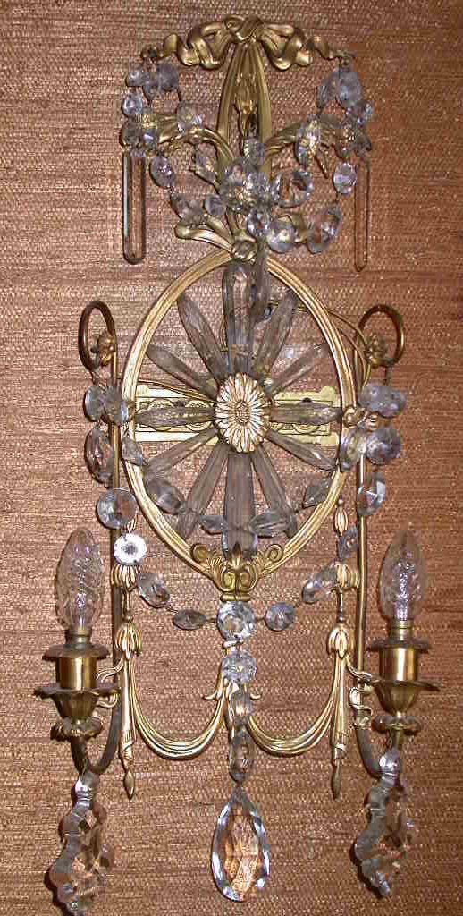 each with ribbon tied surmount suspending cut glass drops and chains, above oval paterae flanked by scrolls suspending further cut glass chains, the two scrolled light branches with leaf cast sconces suspending large shaped drips (2)