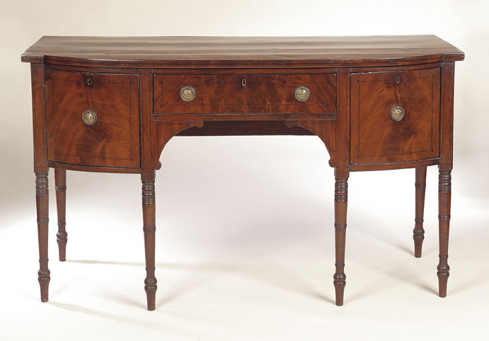 the D-shaped top above an ebony line inlaid frieze drawer flanked by a curved deep drawer and a cupboard door, line inlaid spandrels, on ring turned tapering legs with toupie feet