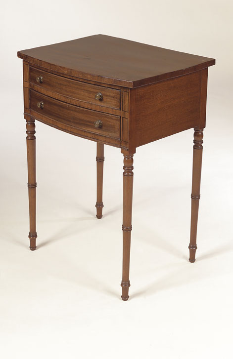 the bowfront rectangular top above two drawers on ring turned tapering legs