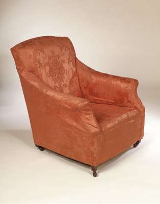 with pink damask cover, loose cushion, on square tapering legs with ceramic castors