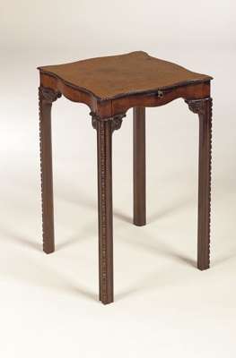 the serpentine gadrooned rectangular top above frieze with slide to the front, on channelled and moulded chamfered square legs with acanthus carved spandrels