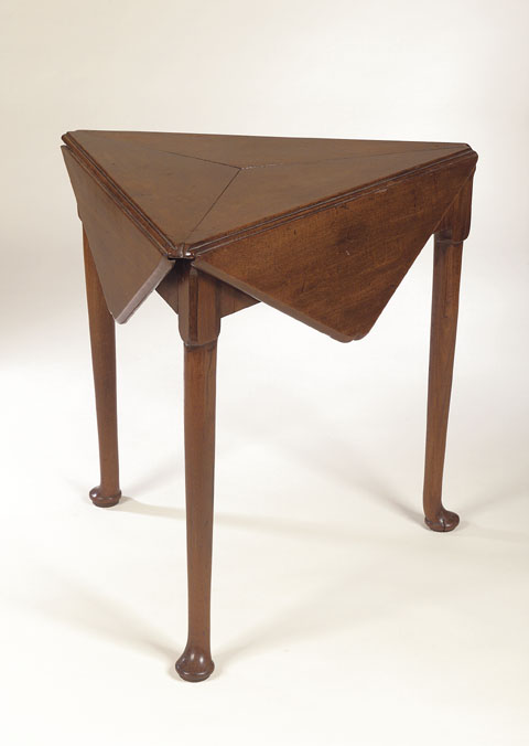 the hinged triangular top swivelling to become hexagonal, on turned tapering legs and pad feet