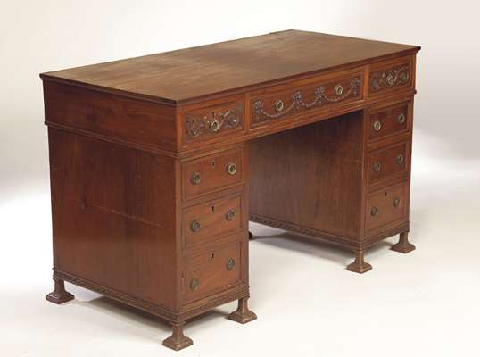 the rectangular top above three scrolling foliate and harebell swag carved frieze drawers, the kneehole flanked by three drawers to one side, a drawer and cupboard to the other, on stiff leaf carved spreading square feet
