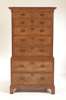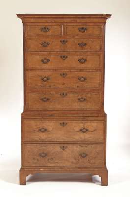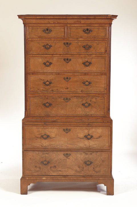 of George I style, the moulded cavetto cornice above two short and three long graduated drawers with feather stringing, flanked by fluted canted angles, raised on base with brushing slide and two further drawers, on shaped bracket feet