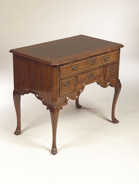 the featherbanded and crossbanded moulded rectangular top above four similarly banded drawers, moulded arch, on cabriole legs with pad feet