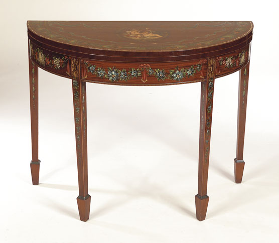 the top with peacock feather border and central panel of a goddess and cherubs suspended from an Earl’s coronet, above frieze painted with ribbon tied festoons, raised on boxwood strung square tapering legs with spade feet
