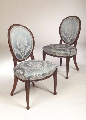 of George III style, each with vine carved and moulded oval back enclosing blue damask upholstered panel, above stuffover serpentine seat, on square tapering moulded legs with rosette terminals and spade feet (6)
