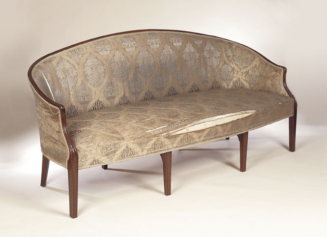 the arched back and sides with moulded framing, on moulded square tapering legs
