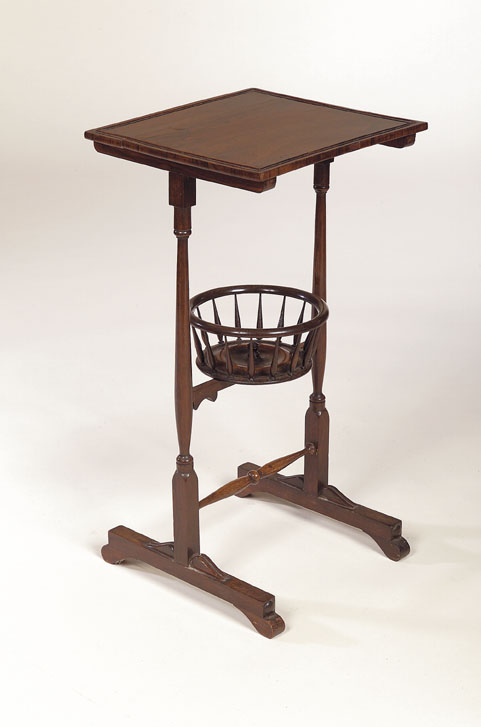 the rectangular top raised on pair of turned and blocked supports joined by later stretcher and spindle turned wool basket, sled base and scroll feet
