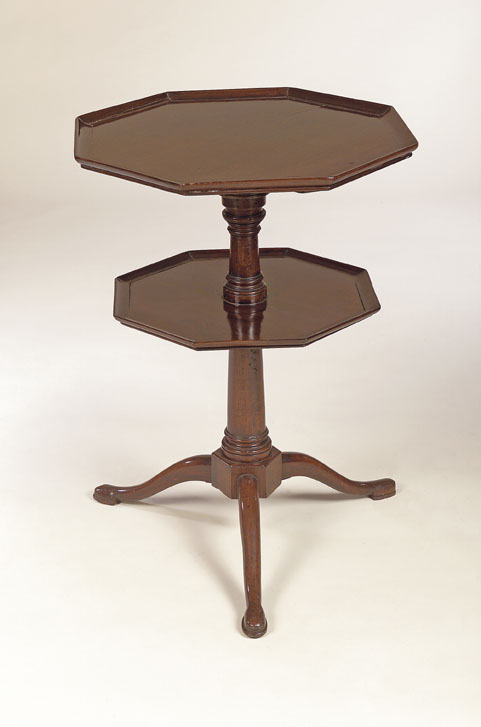 with moulded octagonal tiers, the top one larger, on cannon turned columns, on octagonal base with cabriole legs, adapted