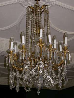 the central column with acanthus scrolls suspending droplet chains, above urn suspending further chains and eighteen acanthus scrolled candlebranches with fluted sconces and spreading drip trays, suspending further chains and pendants, ball pendant to base, fitted for electricity