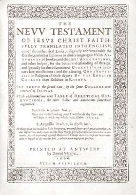 The New Testament of Iesus Christ faithfully translated into English, out of the authentical Latin, diligently conferred with the Greeke, and other editions in divers languages: with arguments of bookes and chapters: annotations, and other helps … by the English College Resident in Rhemes, set forth the second time, by the same College now returned to Douuay … 2nd edition, titlepage within a border of type ornaments, pp. [xxxvi], 745, [xxvii], later full dark blue crushed morocco, spine decorated gilt in compartments, a.e.g., some annotations in a contemporary hand to the "Table of heretical corruptions", single wormhole through the inner margin of several gatherings, small 4to., Antwerp: Daniel Vervlet, 1600