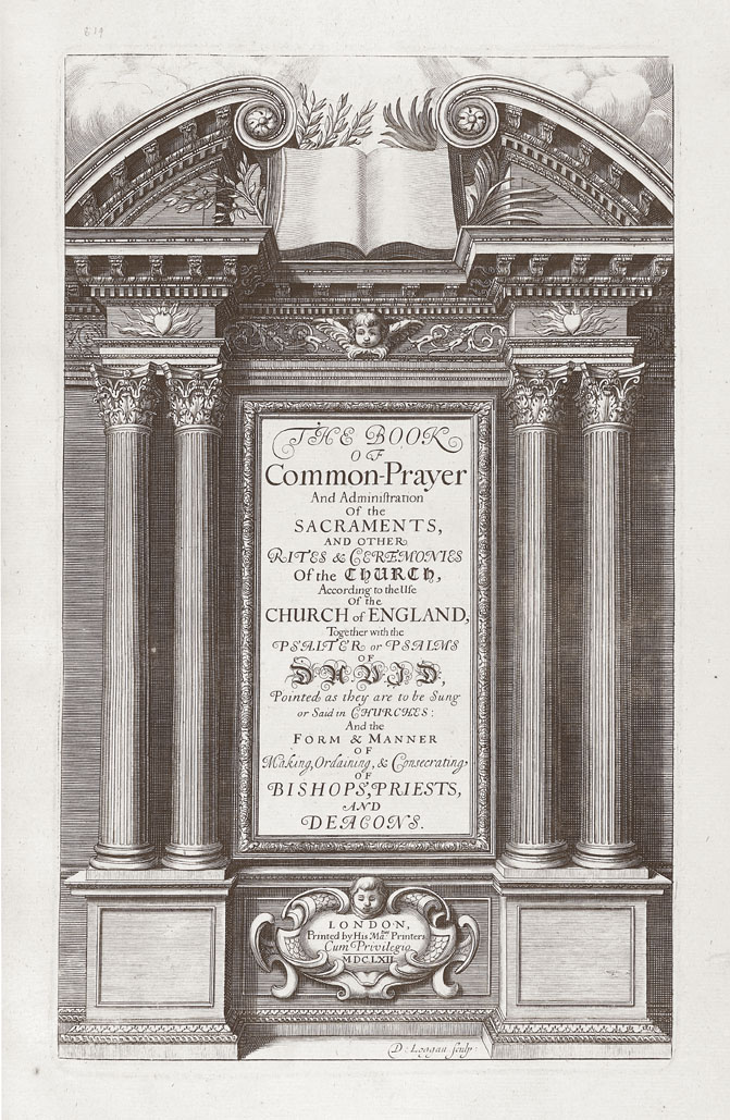 The book of common-prayer and administration of the sacraments, and other rites & ceremonies of the Church of England … Title within an engraved architectural border by David Loggan, but without the frontis. by Hollar, Black Letter, woodcut initials, later full sprinkled calf, covers panelled with gilt filets with crown ornaments at the corners, spine decorated gilt in compartments, red morocco lettering pieces, inner gilt doublures, a.e.g., by Bedford, London: His Majesties Printers, 1662