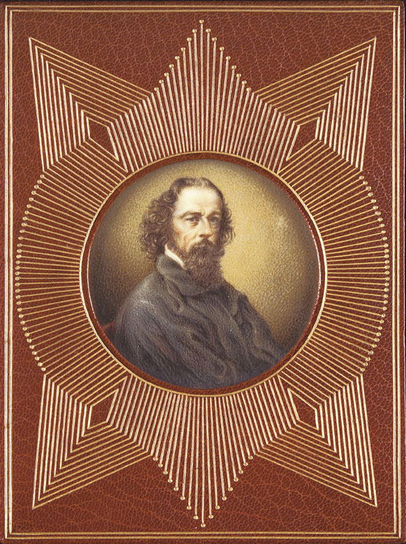 A selection from the works ... (Moxon's miniature poets) ... Port. frontis., Cosway binding of brown crushed morocoo, upper cover with a watercolour portrait on ivorine of Tennyson, by C.B. Currie, set within a star decoration, spine decorated gilt in compartments, pale yellow watered silk endpapers, inner doublures, t.e.g., by Riviere, in its original fleece lined slipcase, small. 8vo., London: Moxon, 1865