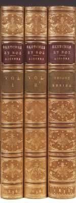 Sketches by "Boz" illustrative of every-day life and every-day people [1st and 2nd series] … 1st editions, 3 volumes, 26 engraved plates (including an engraved title to the 2nd series) by George Cruikshank, vol. 2 with plate 8 misbound to face p. 234, and the 2nd series with "The streets - morning" facing the engraved title rather than "Vauxhall", late 19th century light tan calf, spines decorated gilt in compartments, red and green morocco lettering pieces, a.e.g., 8vo., London: Macrone, 1836-37 [i.e. all 1836] [3]