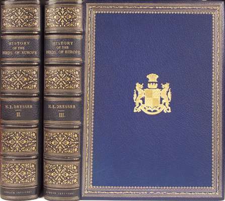A history of the birds of Europe, including the Western Palaeartic region … [with] Supplement … 1st edition, 9 volumes, 721 hand finished lithographic plates, 2 black and white plates, full blue morocco, covers with gilt borders, upper covers with the arms in gilt of Edward 4th Baron Sherborne, spines decorated gilt in compartments, inner gilt doublures, marbled endpapers, a.e.g., with the Sherborne Library bookplate, 4to., London: by the author, 1871-81 [9]