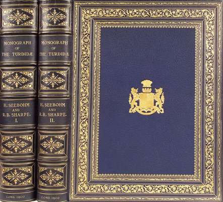 A monograph of the turdidae or family of thrushes … edited and completed by R. Bowdler Sharpe … 1st edition, 2 volumes, port. frontis., 149 hand coloured plates, full blue morocco, the covers panelled with elaborate gilt floral borders within gilt filets, with the arms of Edward 4th Baron Sherborne on the upper covers, the spines decorated gilt within compartments, inner gilt doublures, marbled endpapers, a.e.g., with the bookplate of Sherborne Library, offsetting from the port. frontis. to the titlepage of vol. 1, some instances of light spotting, folio, London: Sotheran, [1898] -1902 [2]
