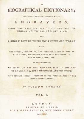 A biographical dictionary containing an historical account of all the engravers from the earliest period … to the present time and a short list of their most esteemed works with ciphers, monograms, and particular marks, used by each master … to which is prefixed, An essay on the rise and progress of the art of engraving, both on copper and on wood … 1st edition, 2 volumes extended to 4, with 19 original (of 20?) plates of which 2 are hand coloured, and extra illustrated by some 450 additional engravings, mezzotints, etchings, prints, portraits, etc. (mostly mounted, but with some loosely inserted), later full green morocco, gilt panelled, a.e.g., inner gilt dentelles, by Andrew Grieve of Edinburgh, 4to., London: Robert Faulder, 1785 [4]