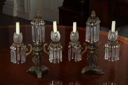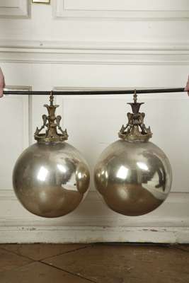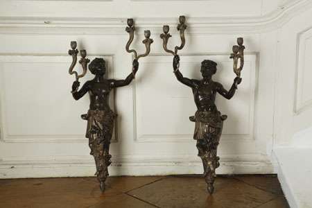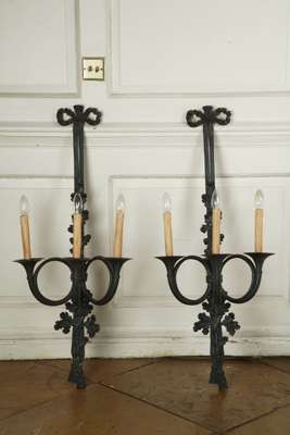 A pair of French carved giltwood and ebonised twin branch wall lights