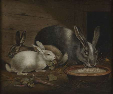 depicting three various rabbits eating greens in an interior, within a giltwood and gesso frame
