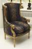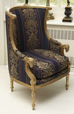 the curved back, arms and cushioned seat covered in dark blue acanthus and shell striped fabric, moulded frame, the arms with ram’s head terminals, on fluted turned tapering legs