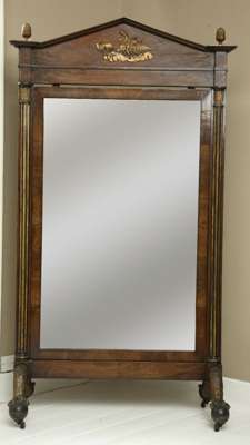 of Empire style, the rectangular mirror plate in plain frame, flanked by fluted demi columns, with architectural pediment centred by a maiden playing a lyre, seated on a winged chariot drawn by butterflies, pineapple finials, the base with hairy legs and paws clutching ball feet fitted with brass castors
