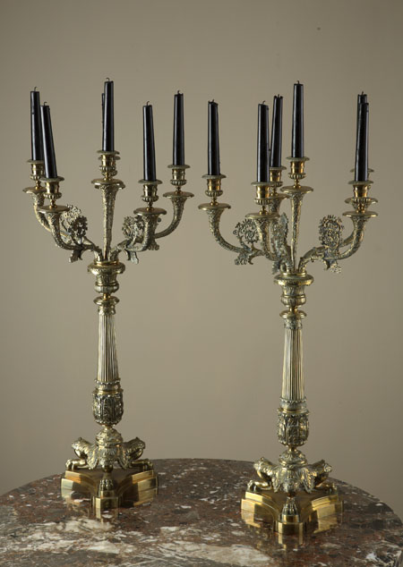 of Empire style, each with ornate acanthus leaf, scroll and foliate decoration throughout, the five scroll arms with gadrooned nozzles and enclosing central torchere form arms, the tapered reeded stem ending in claw footed legs, on stepped triform base (2)