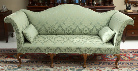 of George II style, the arched back, outscrolled arms and seat covered in green damask fabric, on cabriole legs with pad feet