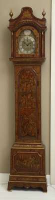 the twin train movement striking on a bell, the brass dial with silvered chapter ring with Roman numerals, subsidiary seconds dial, brass cast spandrels, the hood with domed pediment flanked by pointed ball finials, above arched glazed door flanked by turned columns, the case with arched moulded trunk door decorated with chinoiserie scenes of figures in buildings and landscapes, the panelled base similar, shaped apron,on bracket feet