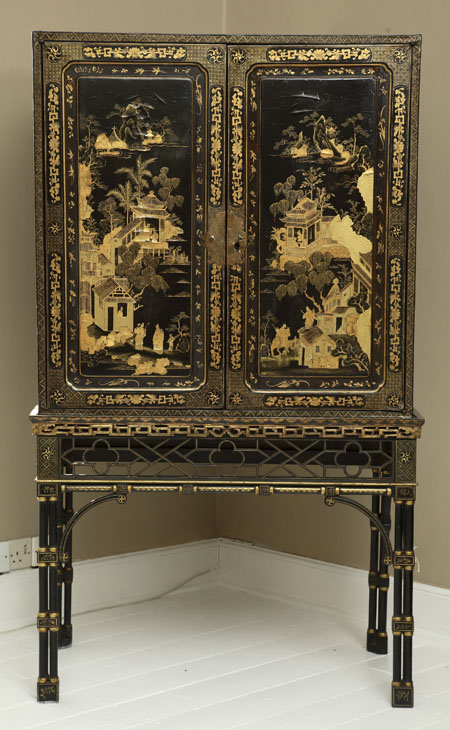 the two panelled cupboard doors decorated with figures and buildings in landscapes, enclosing an architectural balconied interior, with galleried shelves, drawers and doors, on British stand with pierced fretwork frieze and triple cluster column legs, scrolled spandrels, on chamfered block feet