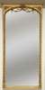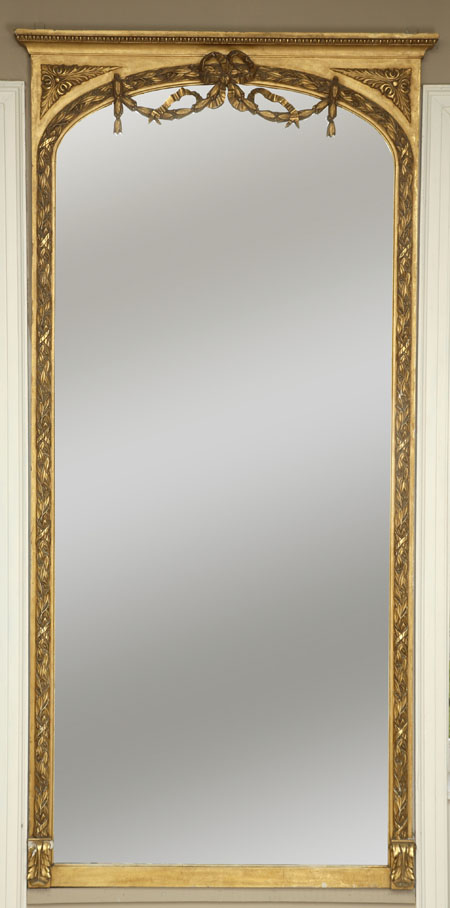 the arched bevelled rectangular mirror plate in tied wreath carved frame, with ribbon tied swag to the top and egg and dart moulded cornice