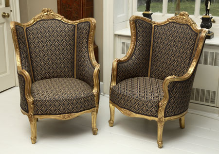 A pair of French giltwood and upholstered wing armchairs
