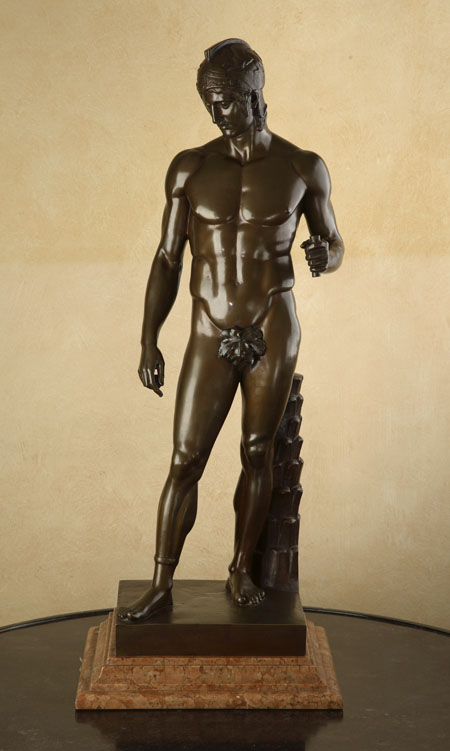 wearing a helmet and leaning against a tree stump, on a square base with moulded marble plinth, stamped 'F Barbedienne Fondeur' and 'Reduction Mechanique, A Collas Brevete'