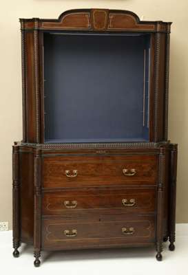 brass line inlaid overall, the arched pediment with central tapering tablet above rope twist columns, the projecting lower section with hinged secretaire drawer, enclosing a fitted interior, above two long frawers, flanked by rope twist columns, on ball feet