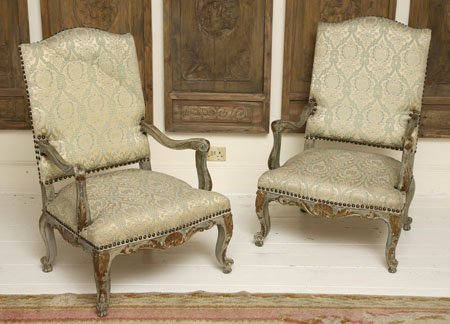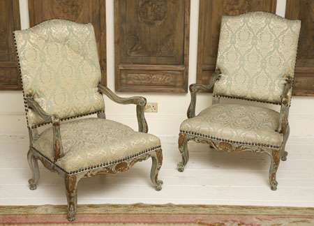 each with arched back and seat covered in close nailed gold and green damask fabric, the frame green and gilt, with scrolled arms, shaped apron centred by a shell issuing acanthus, on shell and acanthus carved cabriole legs with scrolled feet (2)