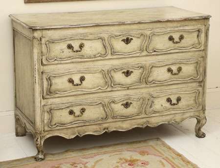 the moulded rounded rectangular top above three long drawers with triple cartouche mouldings, shaped apron, on short cabriole legs with claw and ball feet