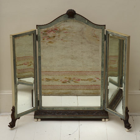 with bevelled mirror plates, the central arched section with carved wood shell cresting and stylised sea serpent carved base, outer sections with marlin supports, on ball feet