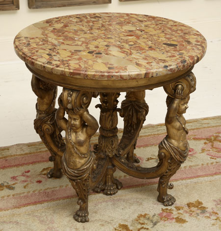 of Louis XIV style, the moulded circular red/yellow marble top on central acanthus carved column and four putto carved columns, joined by a curving X-stretcher, on paw feet