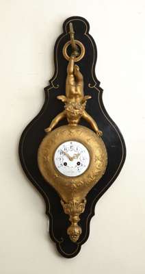 the twin train movement striking on a bell, the white enamelled dial with Arabic numerals and painted with floral swags, the case formed as a putto suspended from a hoop, holding the ovoid foliate cast clock, with fruiting terminal, the whole on shaped ebonised backplate