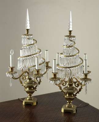 each with lotus leaf and lobed urn stem on square canted base, with four scroll arms and a central ascending drop hung arm ending in a candle sconce, now with cut glass finials (2)