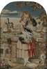 depicting a young girl holding a spaniel in an Italianate landscape, within a burr maple frame
