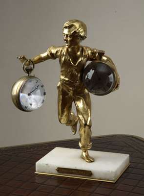 of a running young boy, holding in one hand an associated globular pocket watch and under his arm a corresponding watch, on a white marble and brass base, bears plaque, 'SAUVE QUI PEUT par Henri Godet'