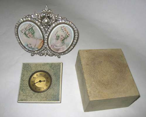 the circular brass dial with square case; a 1930's shagreen cigarette box, of rectangular form; and an Edwardian paste set double portrait miniature, in the mid 18th century French taste (3)