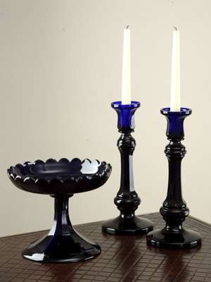 with scalloped rim above faceted flaring stem, 19.5cm high; together with a pair of blue glass candlesticks, each with faceted column above spreading circular foot, 31cm high (3)