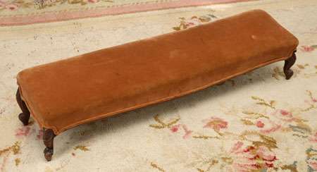 the sloping rectangular seat covered in orange fabric, on cabriole legs with tapering feet