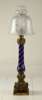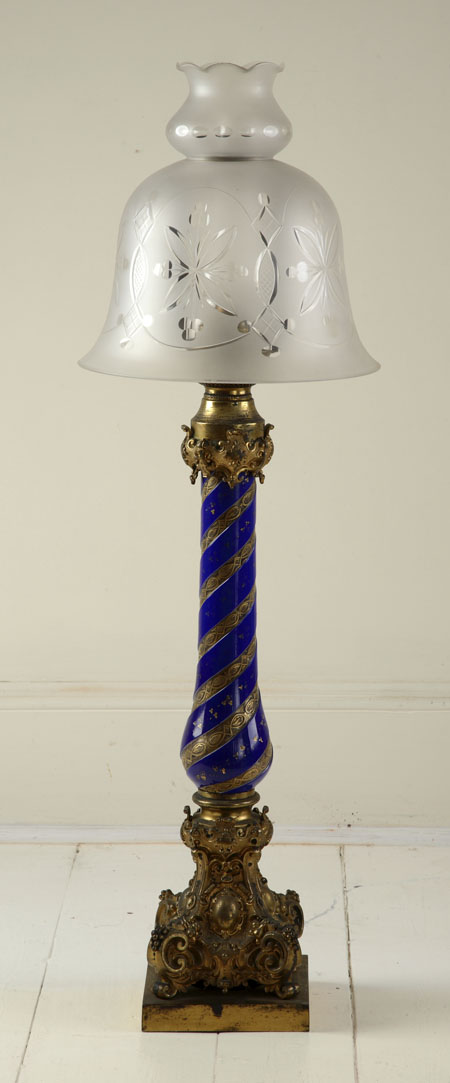 with later etched opaque glass shade, the spiral gilt decorated blue glass stem on an ornate cabochon and scroll cartouche base with square plinth, burner marked, 'Palmer and Co Patent', lamp collar marked, 'Registered July 14th 1847'