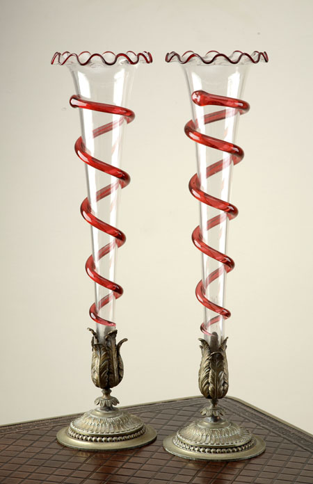 each with frilled rim and a trailed ruby glass snake, with foliate cast giltmetal mount (2)